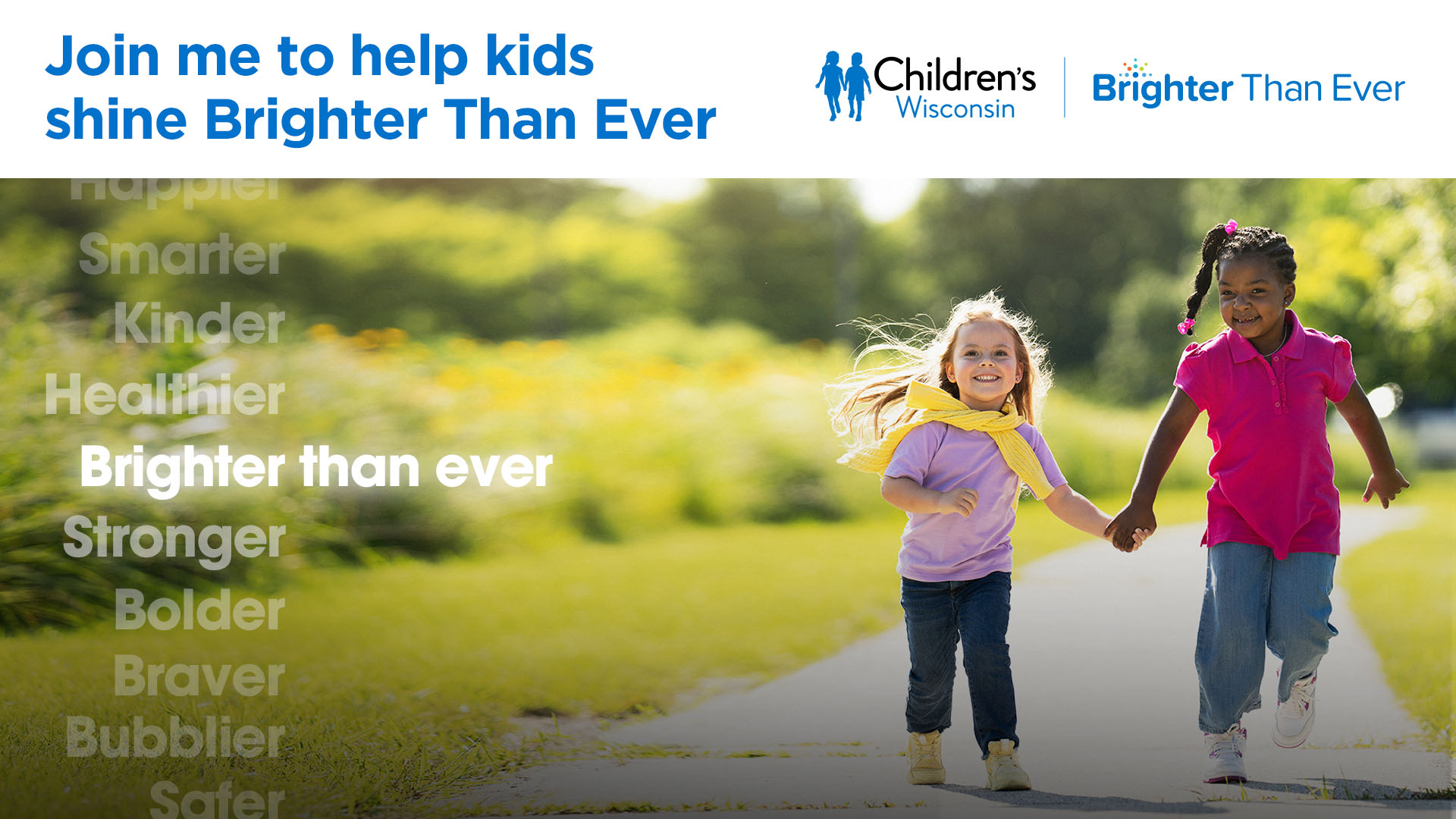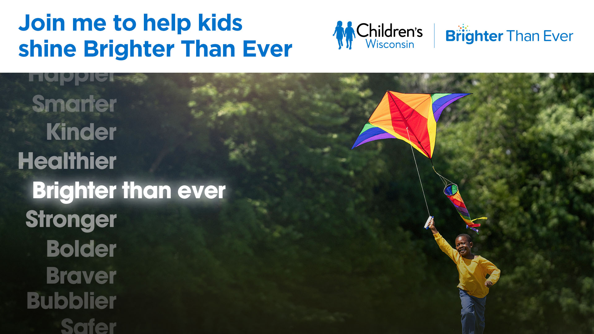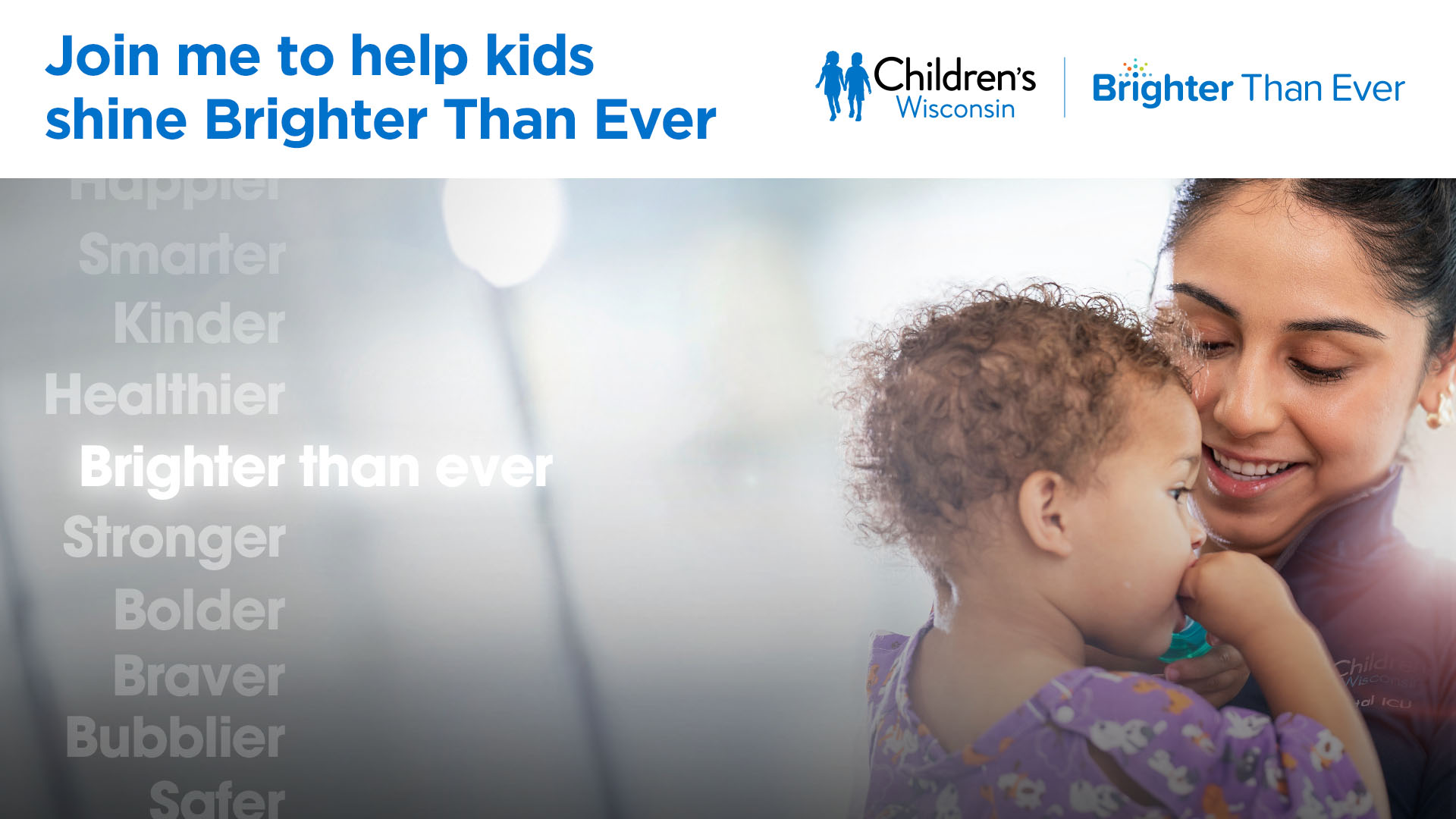 Together — with the below materials that include campaign messaging and tools to help you share your Children’s Wisconsin pride — we have the power to illuminate futures that are Brighter Than Ever for the kids and families of Wisconsin.